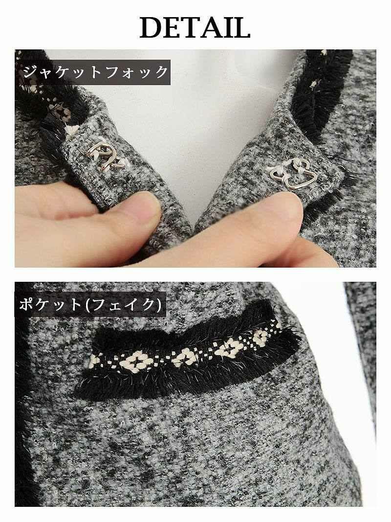 パイピングやフリンジがアクセントとなり、ノーカラージャケットが洗練された印象を演出。