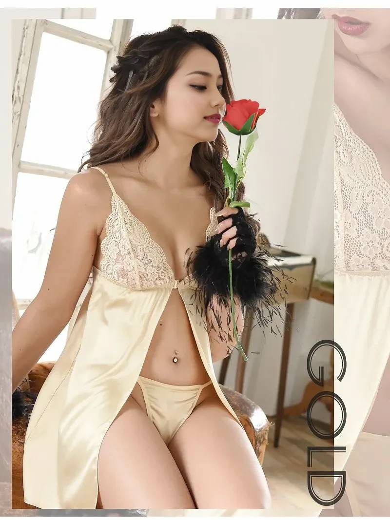 セクシーランジェリー2点セット ワンカラースカラップレースキャミソール ベビードール【Rwear】(S-M)(ゴールド/バーガンディ)