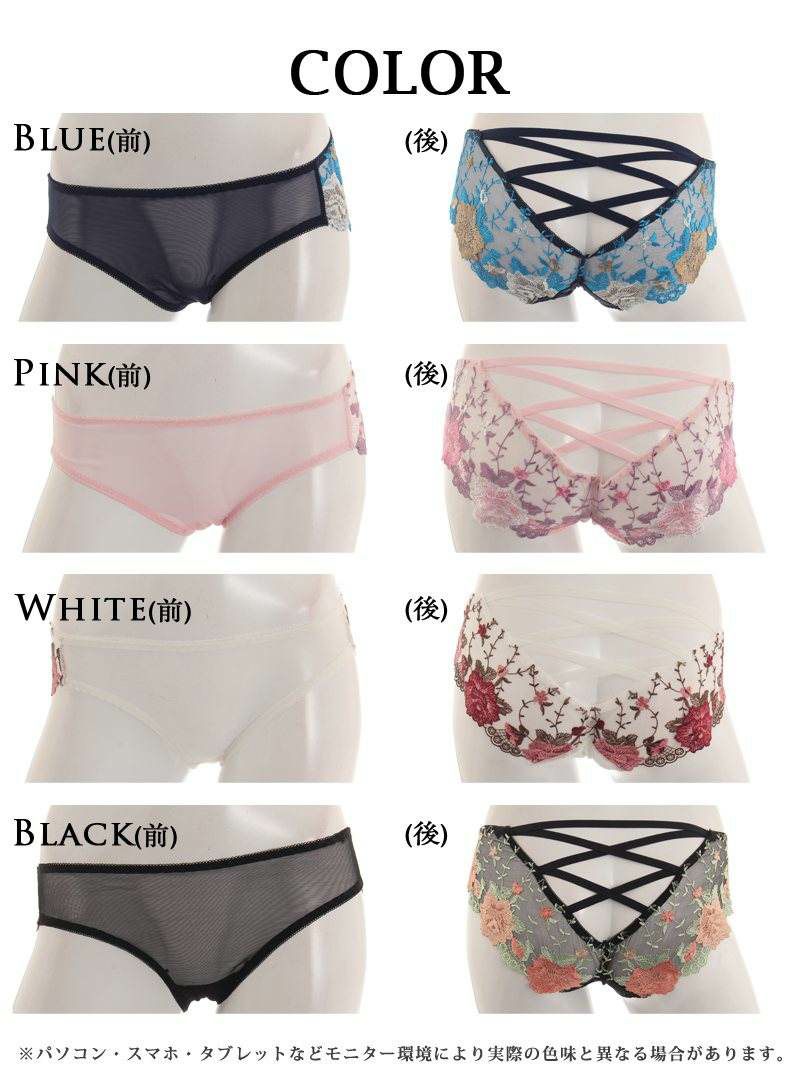えちえちバッククロス花刺繍ショーツ バッククロス花刺繍ショーツ バックデザインセクシーショーツ【Rwear】(M)(ブルー/ホワイト/ピンク/ブラック)