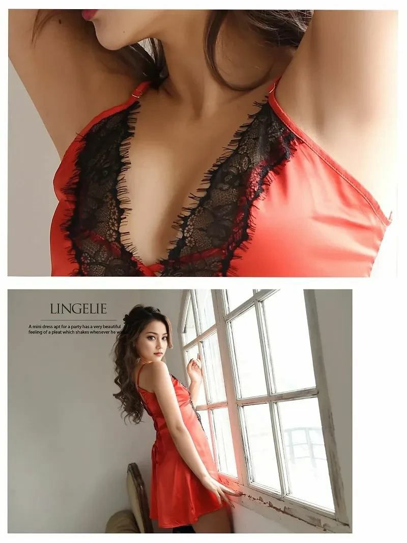 魅惑のブラックレースベビードール ブラックレースキャミソールベビードール 単色刺繍レースランジェリー【Rwear】(S-M/M-L)(ブラック/レッド)