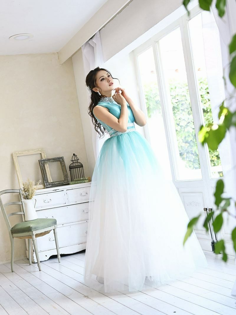 ミントブルーのグラデーションの爽やかな透明感が美しい!ネックとウエストに煌めくスパンコールを散りばめた主役級キャバクラドレス。