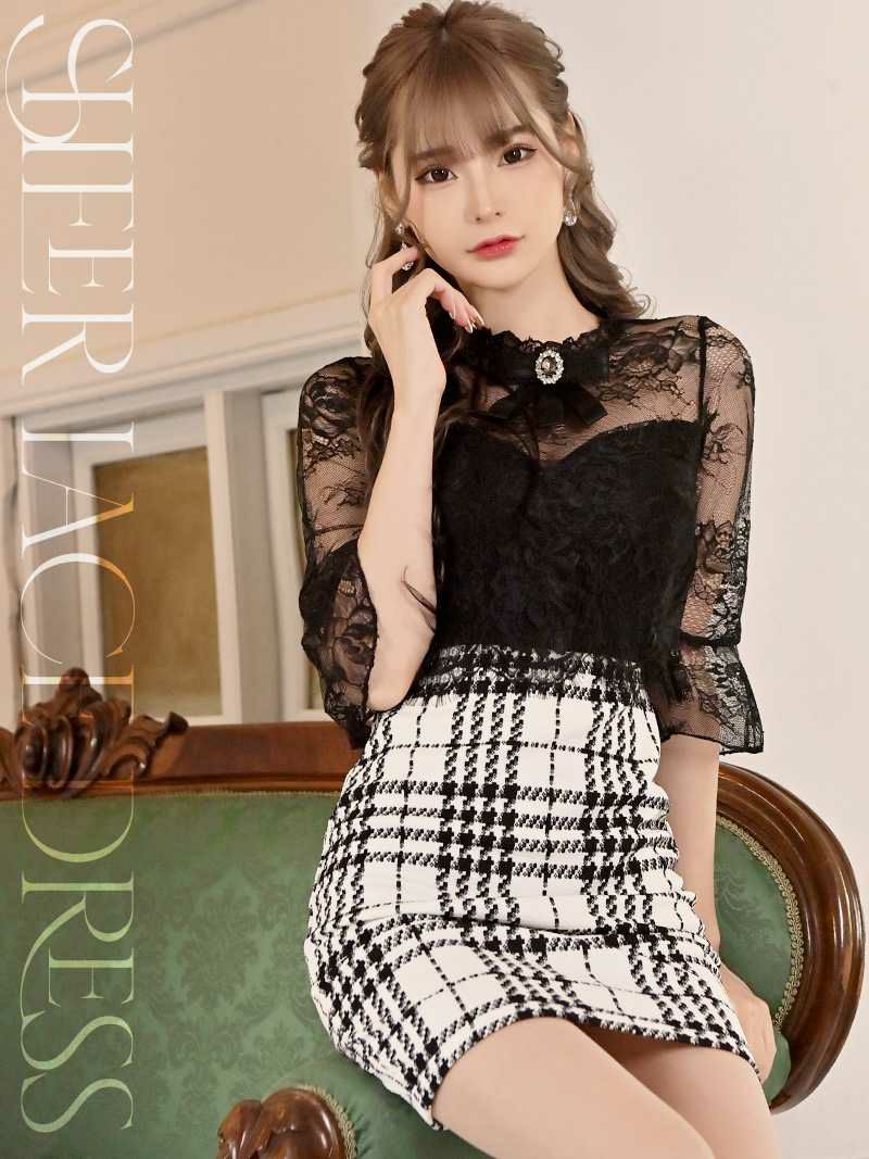 訳あり可愛いチェック柄 【訳ありアウトレット】袖付きレースキャバ嬢ミニドレス【Ryuyu】(S/M/L)(ホワイト/ブラック) ptpl