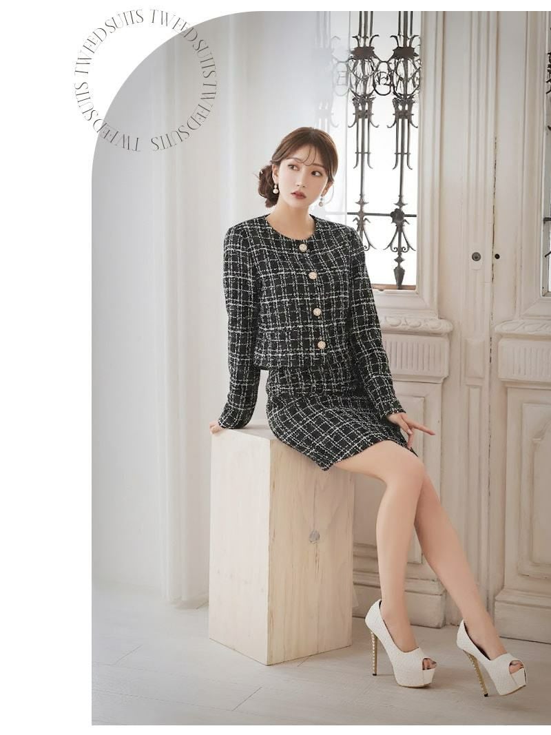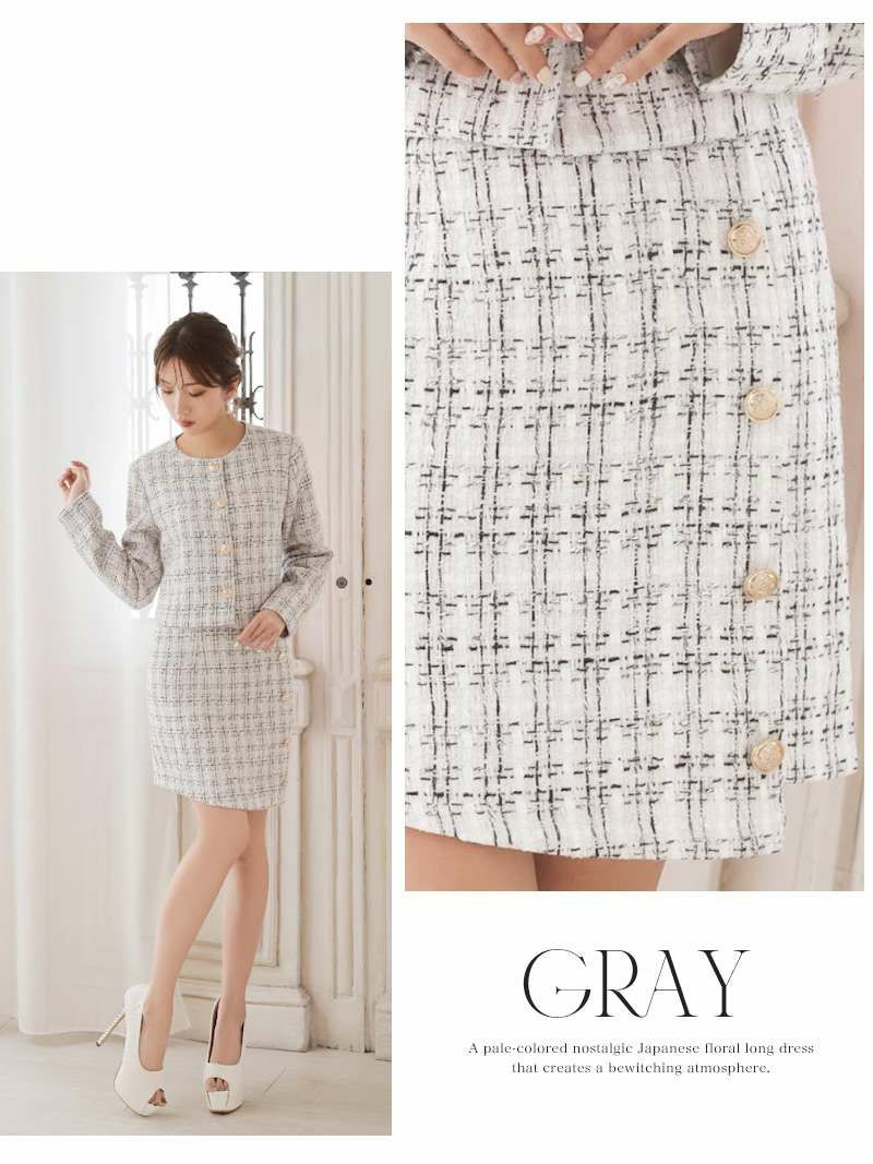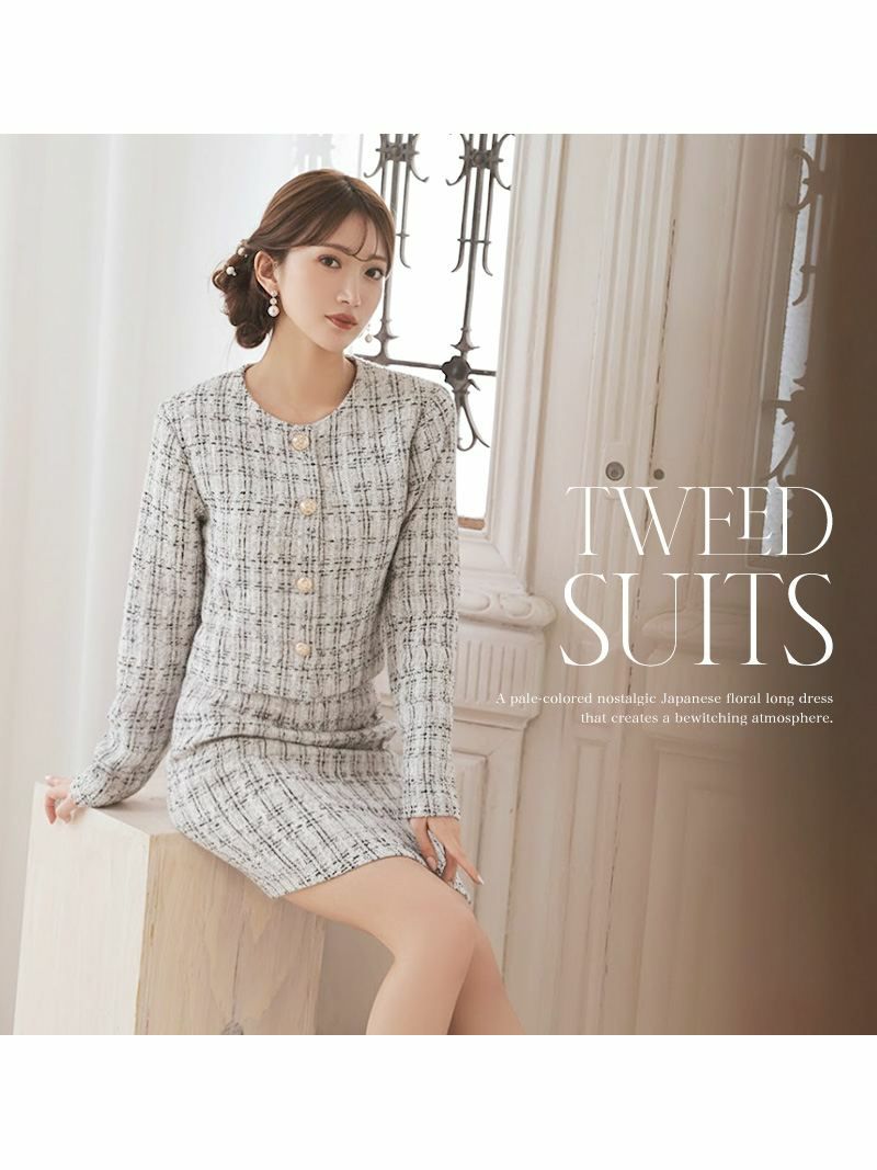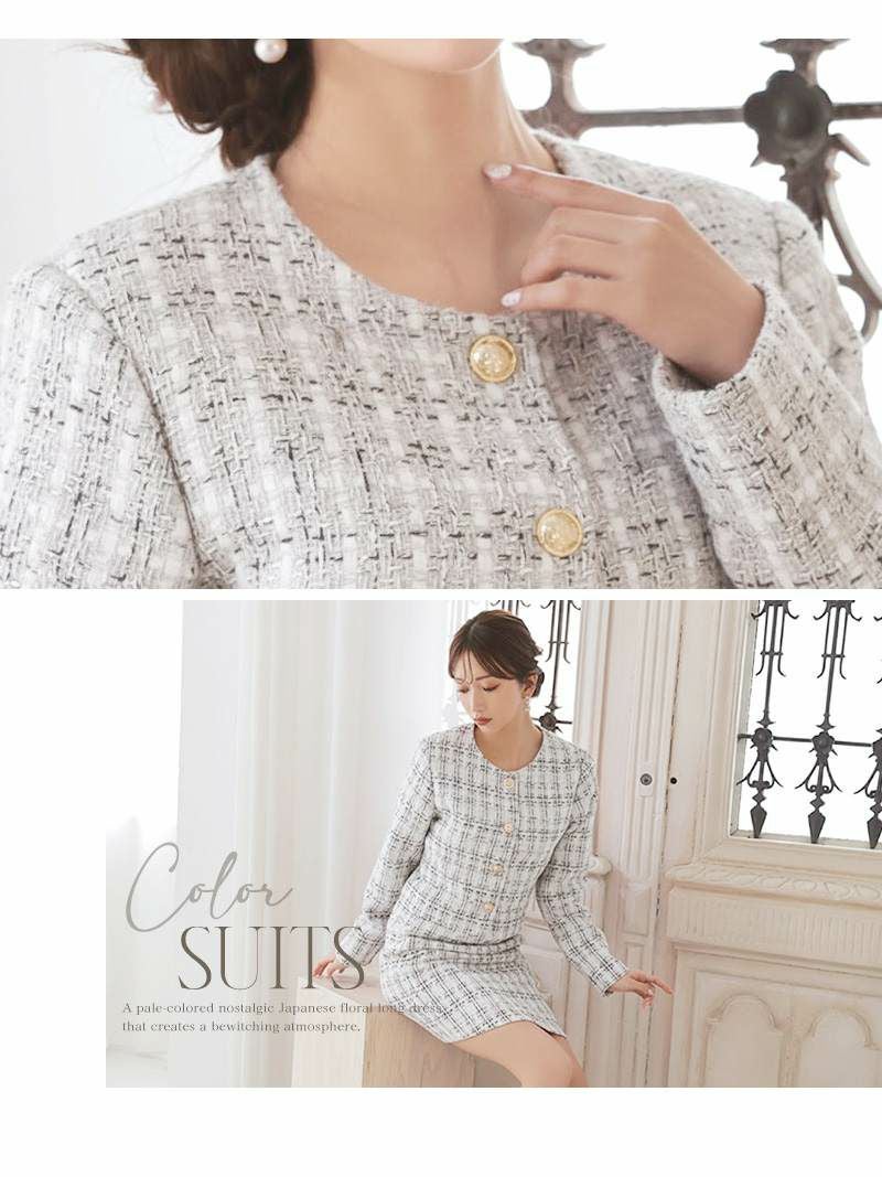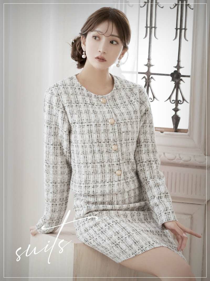 上品なミックスツイード生地が清楚な美しさを引き立てるセットアップスーツです。