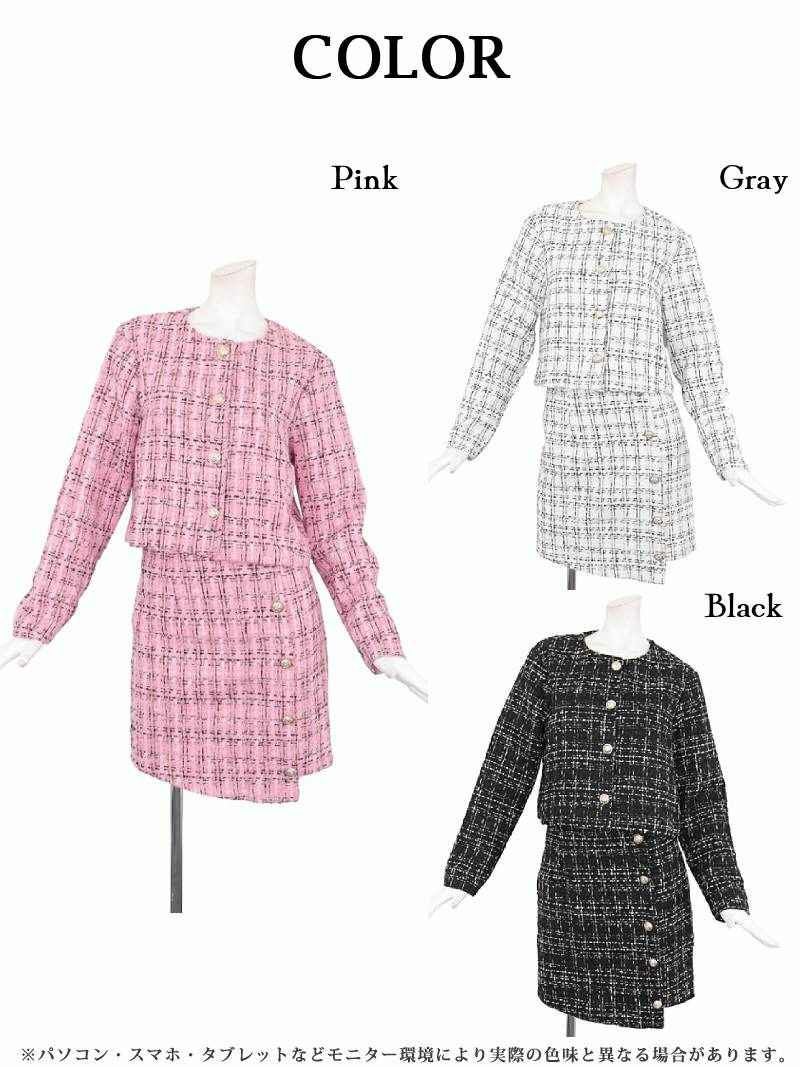 4. ミックスツイード長袖ノーカラースーツ アシンメトリーミニ丈セットアップスーツ【Ryuyu】(S/M/L/XL(2L))(ブラック/ピンク/グレー)