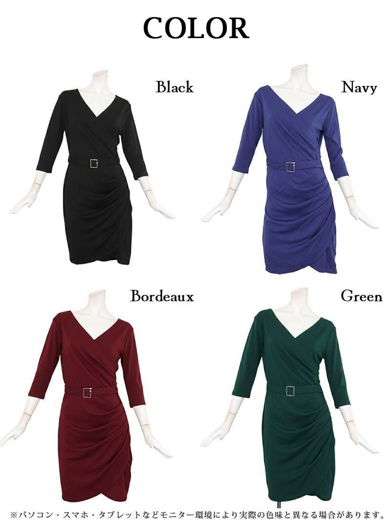 洗練されたカシュクールデザインとベルトマークで、都会的な美シルエットを描く。 先行予約割¥3980→¥3781!※一部予約販売※カシュクールギャザー七分袖タイトミニドレス りせり 着用 キャバドレス【RyuyuChick】(S/M/L/XL(2L)/XXL(3L))(グリーン/ブラック/ワイン/パープル/ブルー)