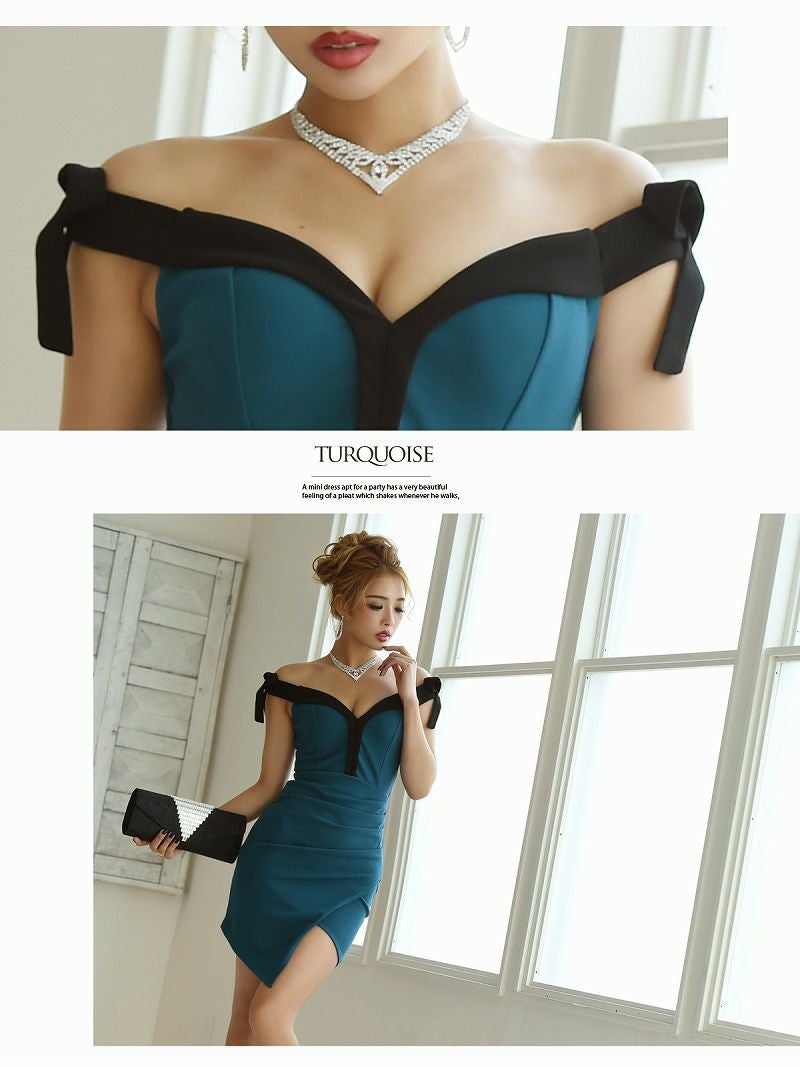 Vカットのデザインがデコルテを華やかに引き立て、オフショルダーのスタイルで大胆な女性らしさを強調。