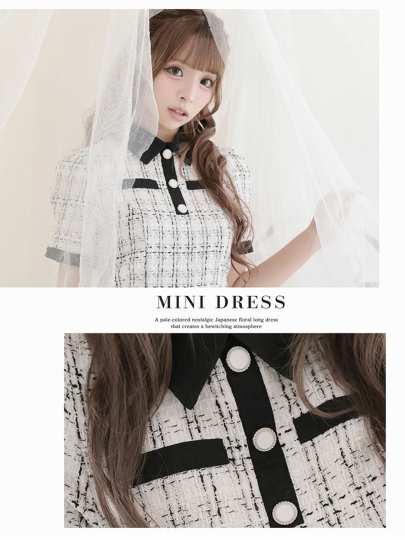 5. 清楚系韓国風Aラインツイード半袖キャバワンピース あいさ 着用 キャバドレス【RyuyuChick】(フリーサイズ)(ブラック/ホワイト)