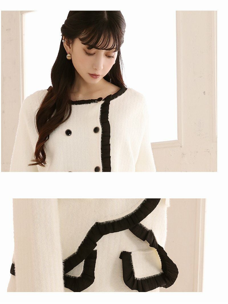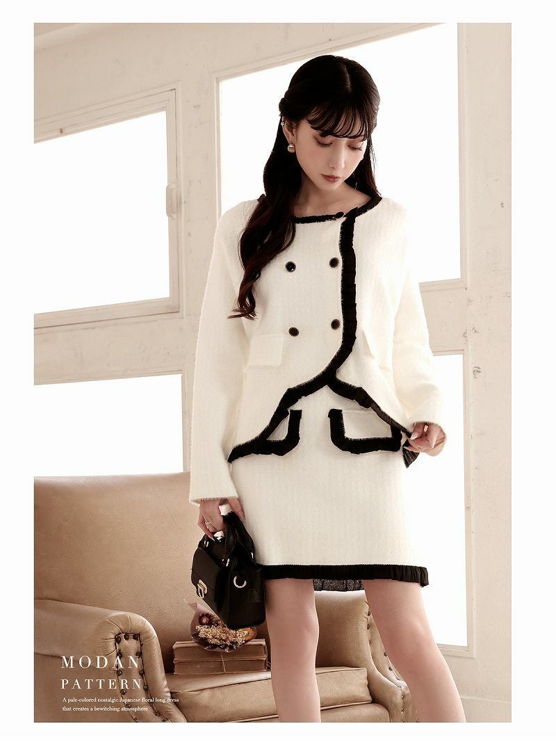 フリルパイピングで上品格上げ フォーマルスーツSALE¥8780→¥4390! ダブルボタンニットセットアップスーツ 加賀美早紀 着用キャバスーツ【Belsia】(M)(ブラック/ホワイト/グリーン)