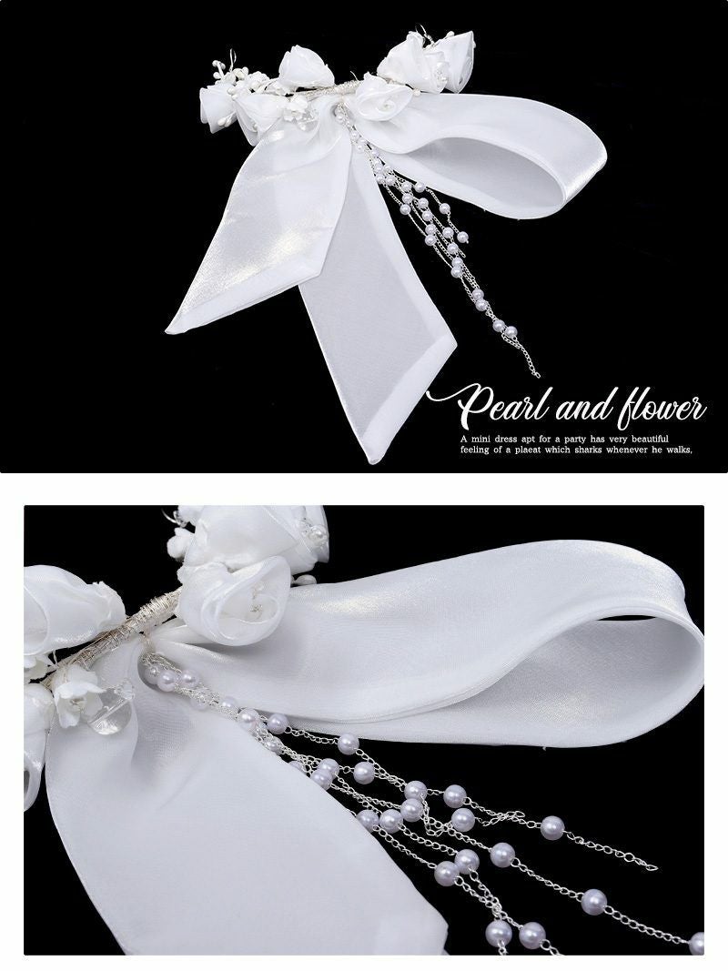 お姫様のような存在感を放つ フラワーリボン×パールチェーンヘアアクセサリー【Ryuyu】(フリーサイズ)(ホワイト)