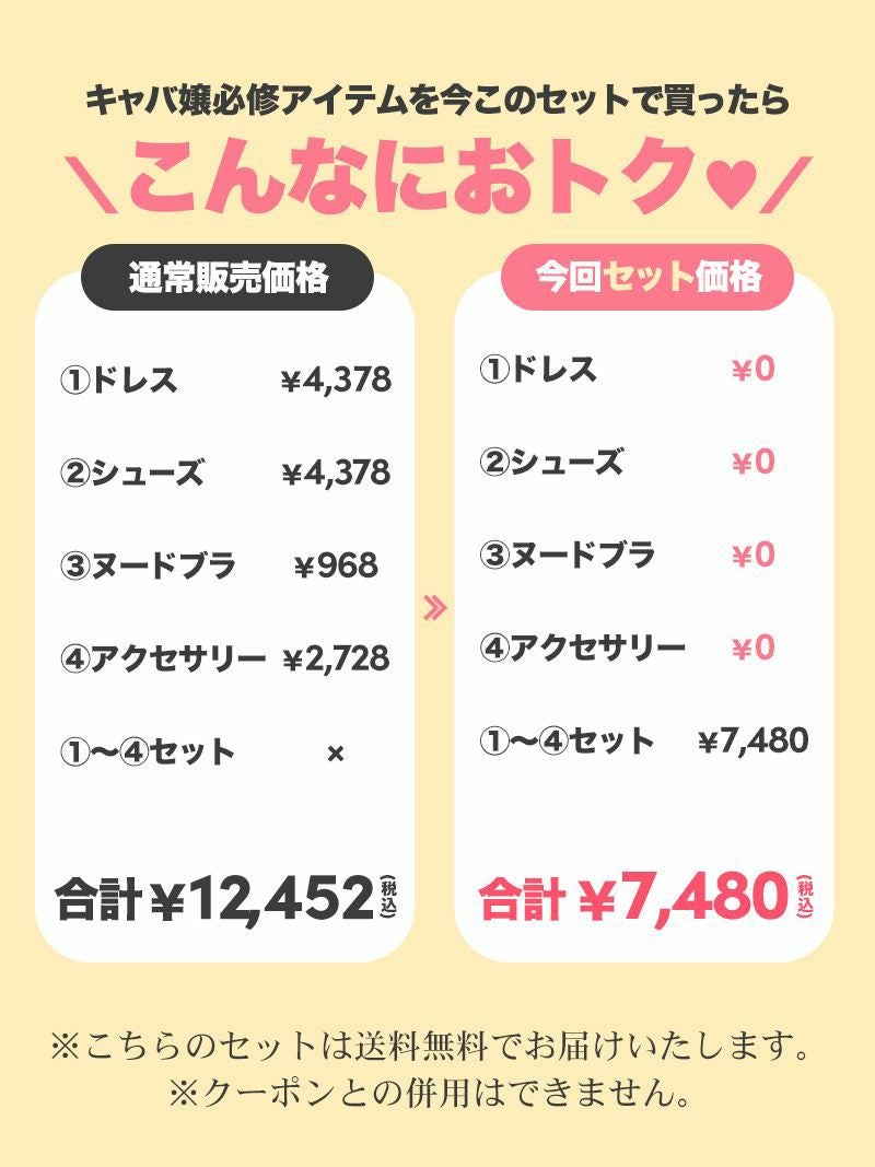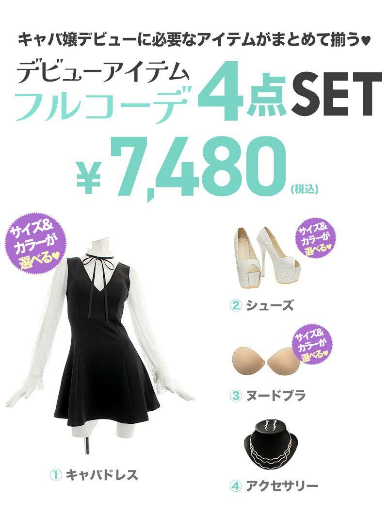 人気キャバドレスに夜職デビューに必須のアイテムのパンプス、ヌードブラ、アクセサリーがセットになったデビューセットをご用意。