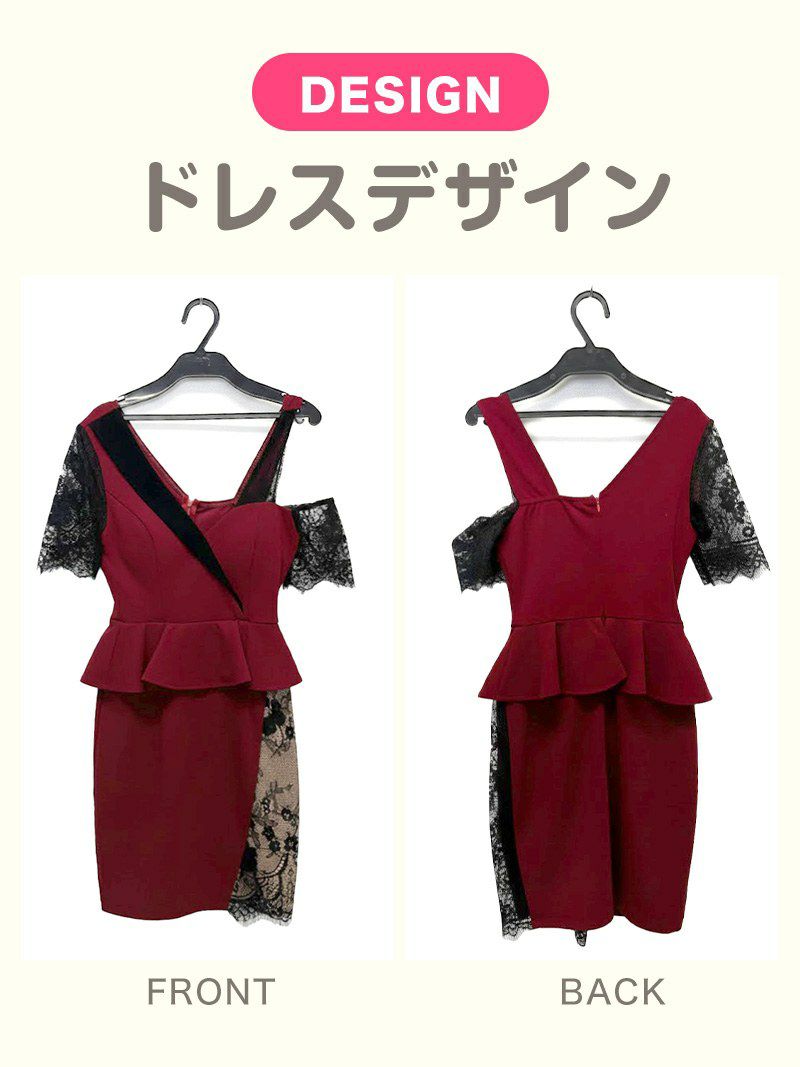 1点限りの限定ドレス 早いものがち!ブラックレース切り替え オフショルペプラムタイトドレス【Ryuyu】(M)(ワイン)