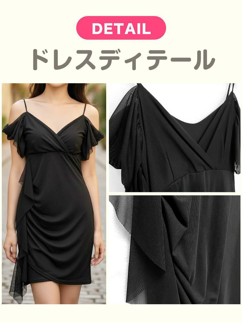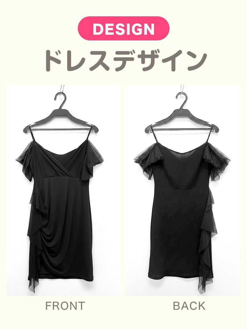 デコルテを綺麗に見せるカシュクールと、肩から流れるシースルーのフリルがエレガント。
