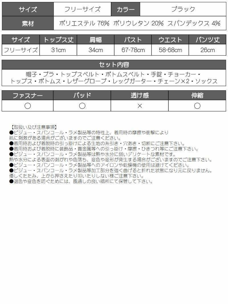 セット内容:帽子・トップス・ブラ・ボトムス・チョーカー・レザーグローブ・レッグガーター・チェーン×2・トップスベルト・ボトムスベルト・手錠・ソックス