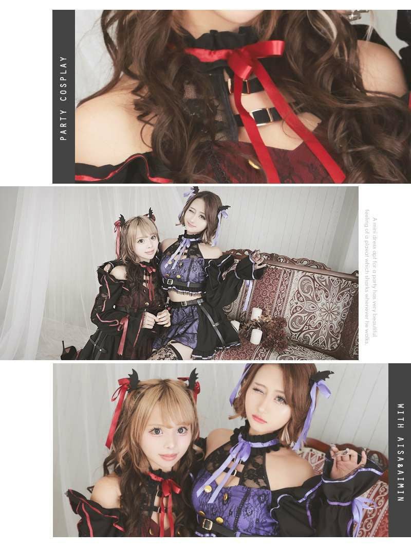 3. コスプレ 袖付きロリータ風吸血鬼ギャルコスプレ あいさ あいみん 着用 レディースコスプレ7点セット【Ryuyu】(フリーサイズ)(レッド/パープル)
