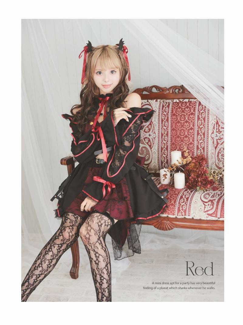 6. コスプレ 袖付きロリータ風吸血鬼ギャルコスプレ あいさ あいみん 着用 レディースコスプレ7点セット【Ryuyu】(フリーサイズ)(レッド/パープル)