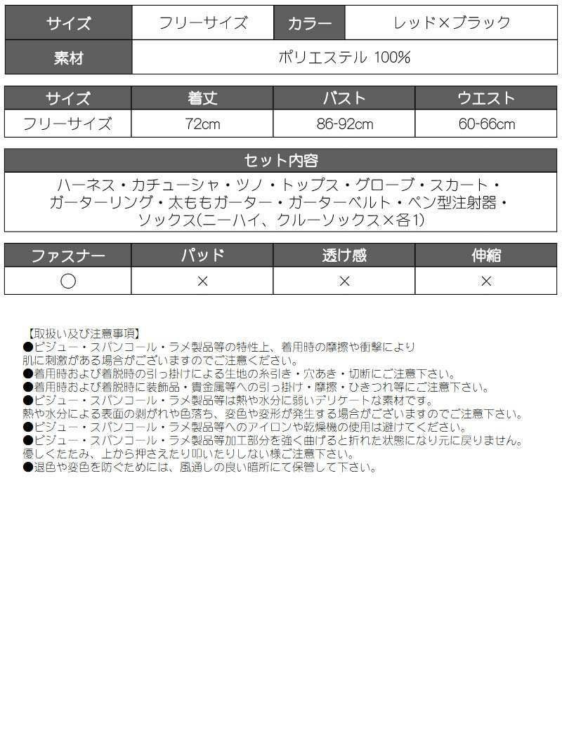セット内容:カチューシャ・ツノ・トップス・スカート・ハーネス・グローブ・ガーターリング・ペン型注射器・ソックス(ニーハイ、クルーソックス×各1)・太ももガーター・ガーターベルト