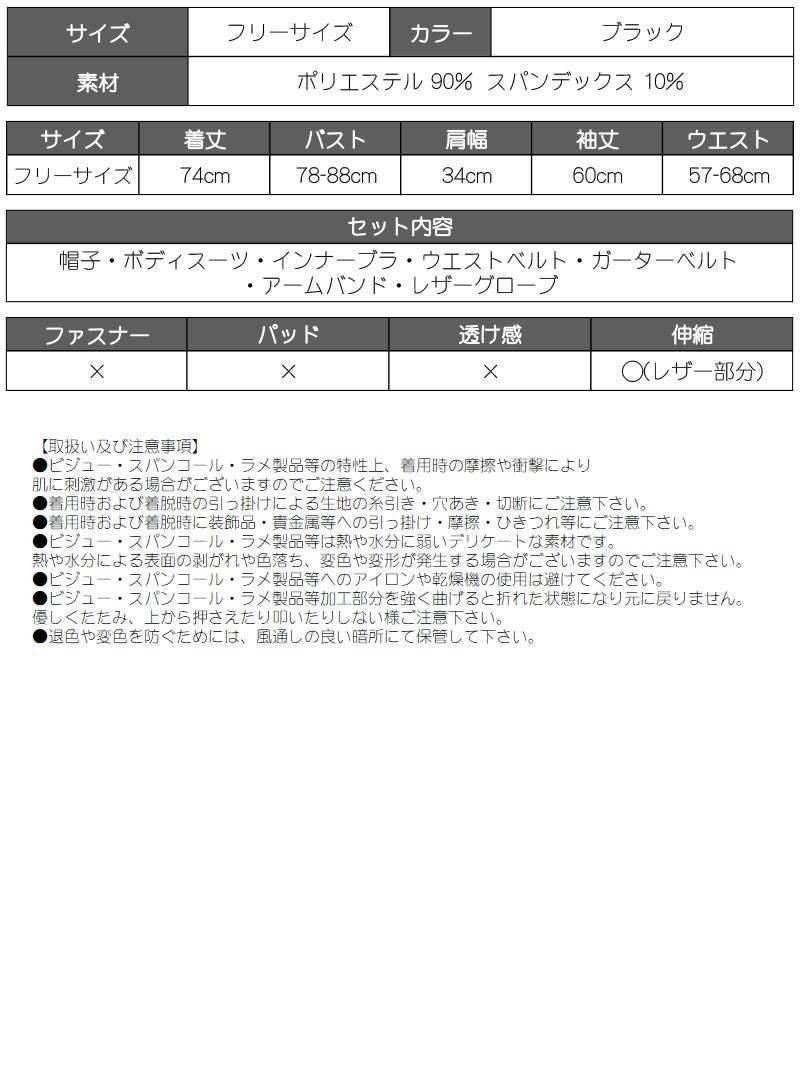 セット内容:帽子・ボディスーツ・インナーブラ・レザーグローブ・アームバンド・ウエストベルト・ガーターベルト