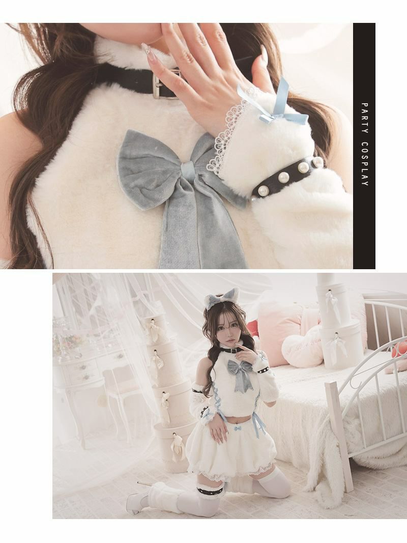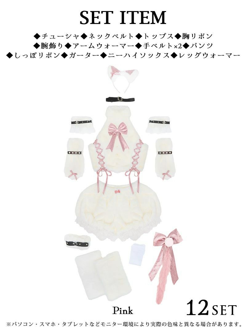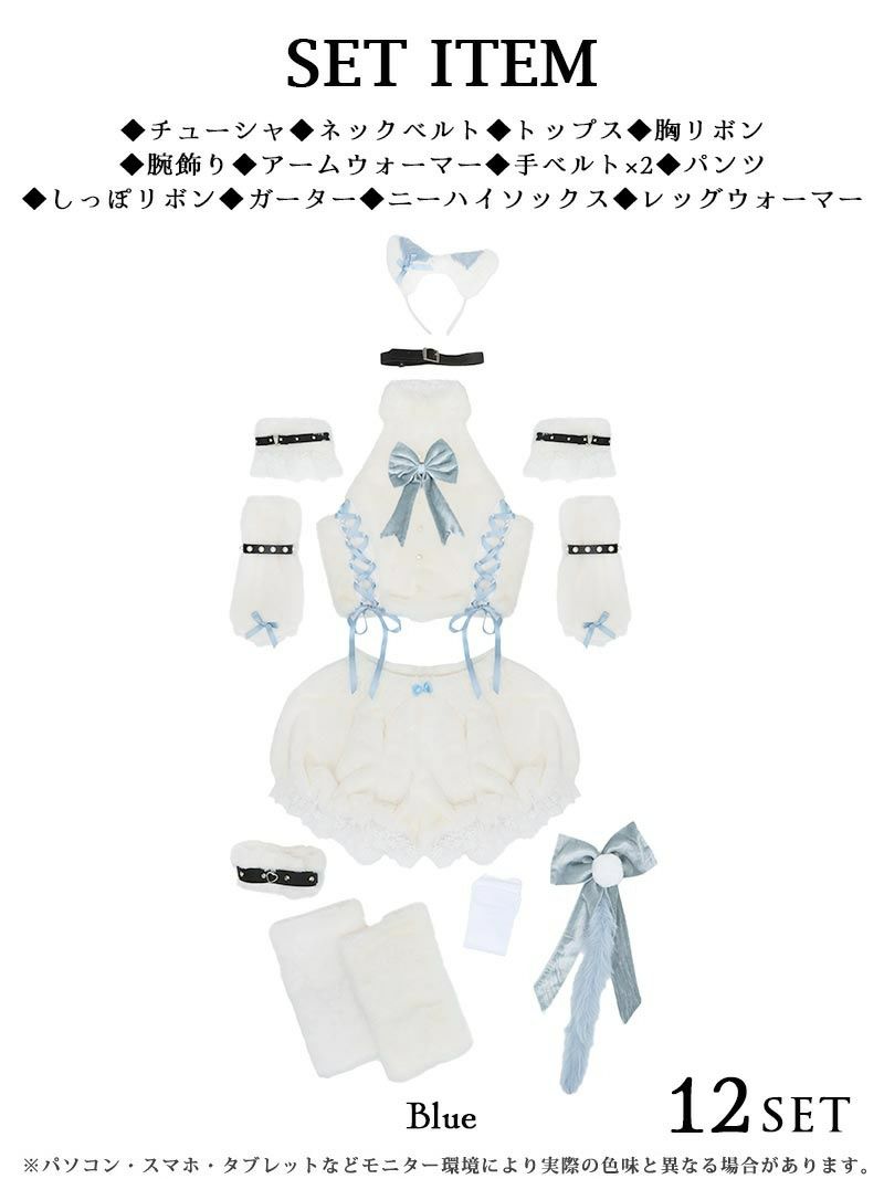 セット内容:カチューシャ・ネックベルト・トップス・胸リボン・腕飾り・アームウォーマー・手ベルト×2・パンツ・しっぽリボン・ガーター・ニーハイソックス・レッグウォーマー