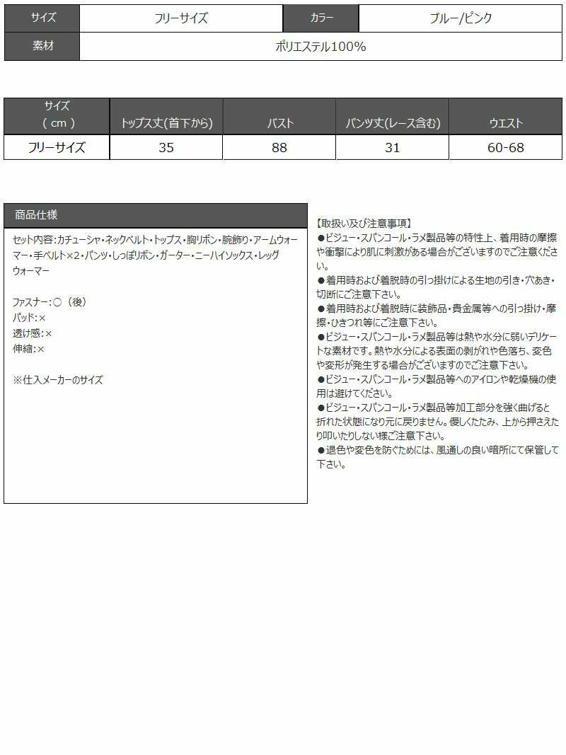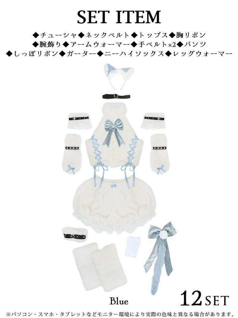 セット内容:カチューシャ・ネックベルト・トップス・胸リボン・腕飾り・アームウォーマー・手ベルト×2・パンツ・しっぽリボン・ガーター・ニーハイソックス・レッグウォーマー