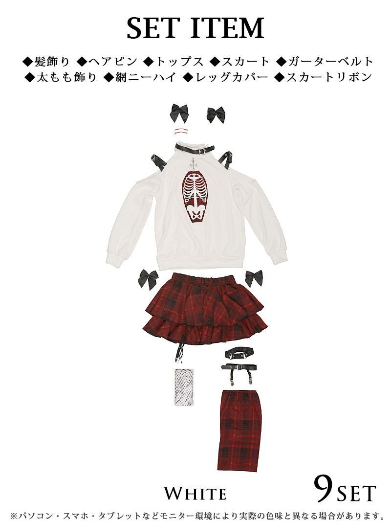 セット内容:髪飾り・ヘアピン・トップス・スカート・ガーターベルト・太もも飾り・網ニーハイ・レッグカバー・スカートリボン