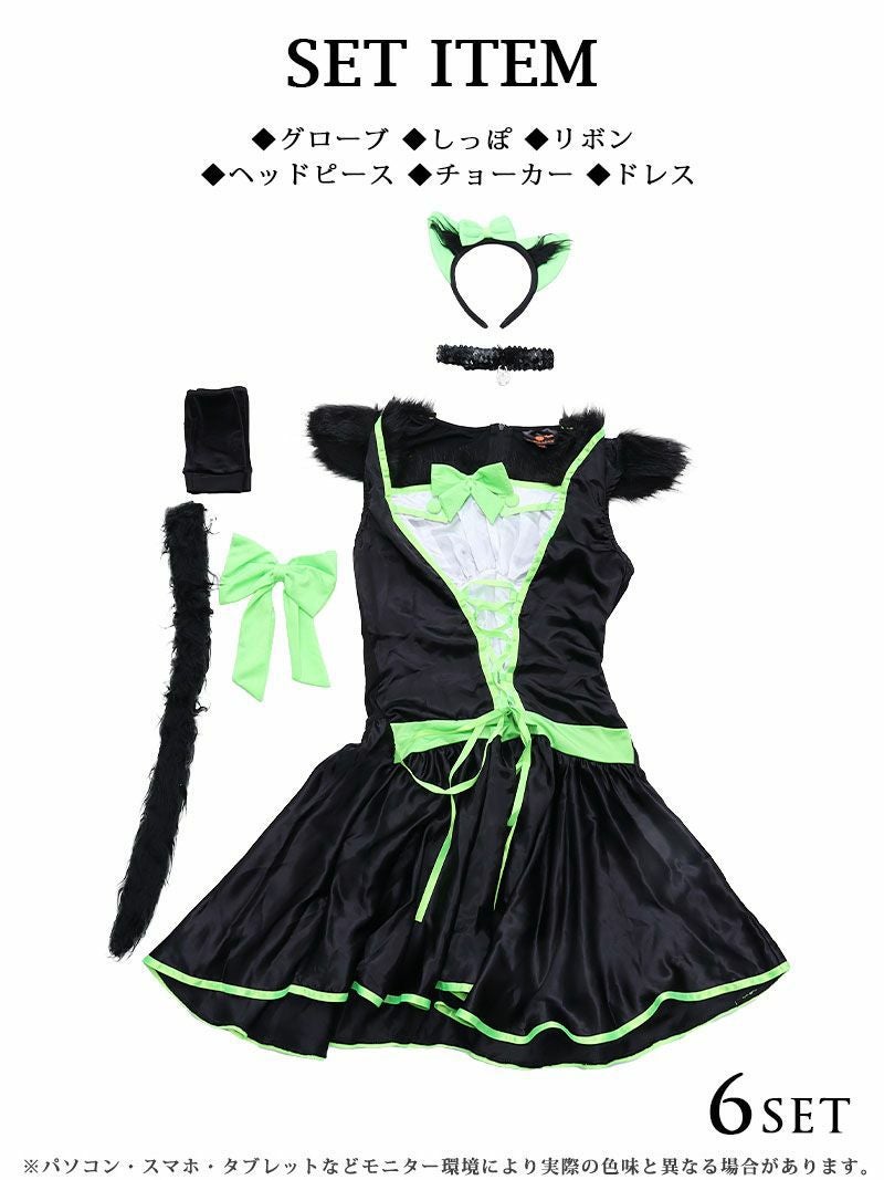6. 【訳ありアウトレット】ハロウィンコスプレ ネオンカラー猫ちゃんハロウィンコスプレ6点セット【Ryuyu】(M)(ブラック)