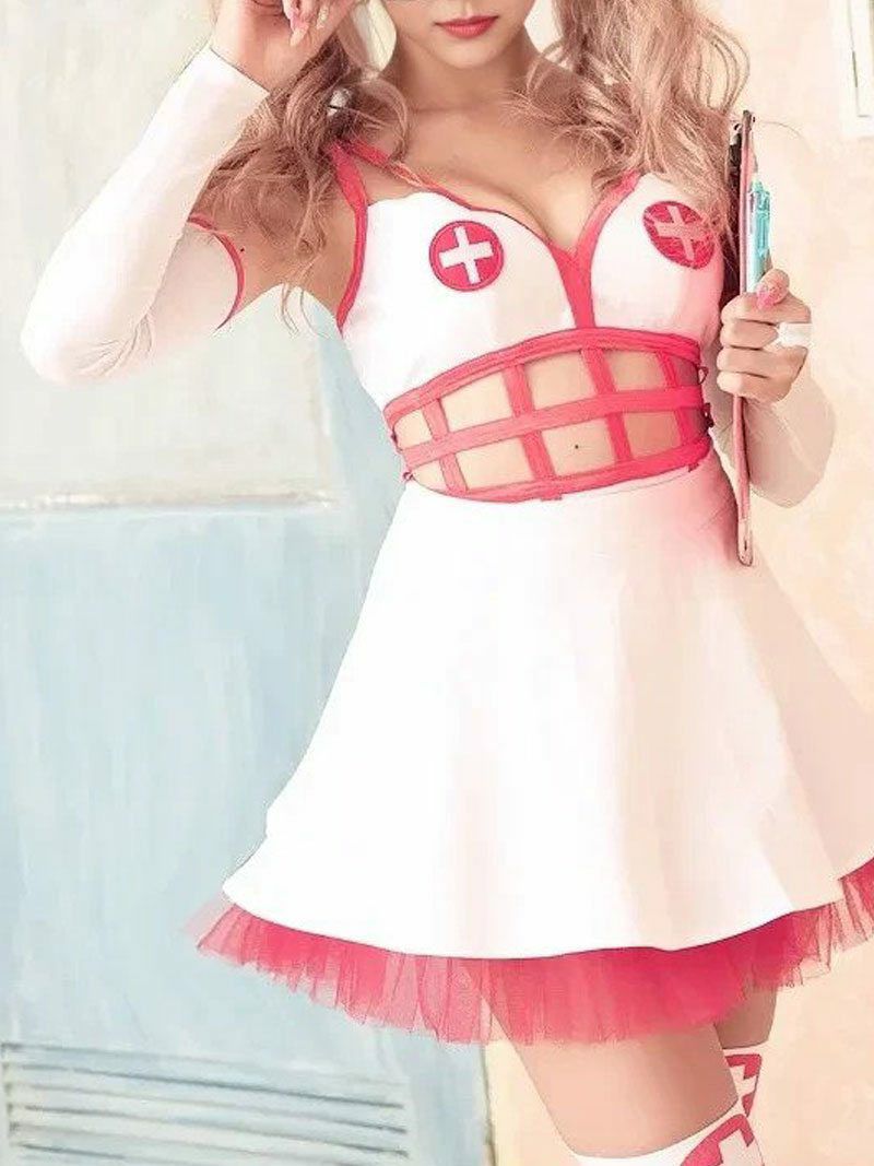 コルセット風デザインの肌魅せがえちえち! 【訳ありアウトレット】ハロウィンコスプレ 5点セット 悩殺谷間魅せ大人セクシーナースコスプレセット【Ryuyu】看護婦コスチュームカットアウトデザインコスチューム(S/M)(ホワイト)