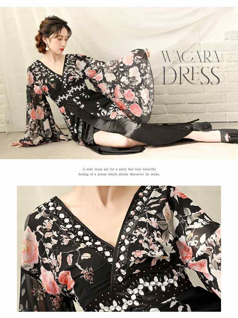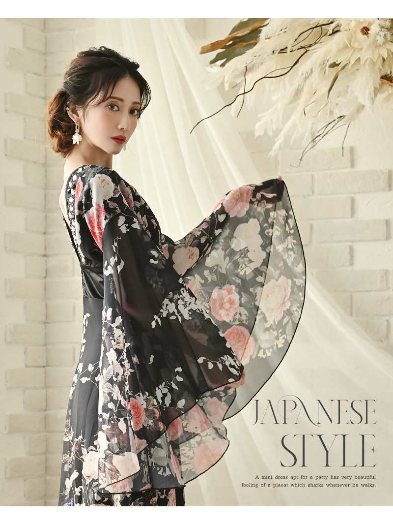 訳あり花魁ブラック 【訳ありアウトレット】漆黒の優美大人ブラック袖付き和柄ドレス【流遊】(S/M/L/XL)(ブラック)