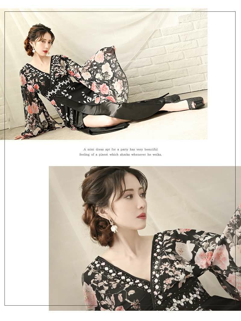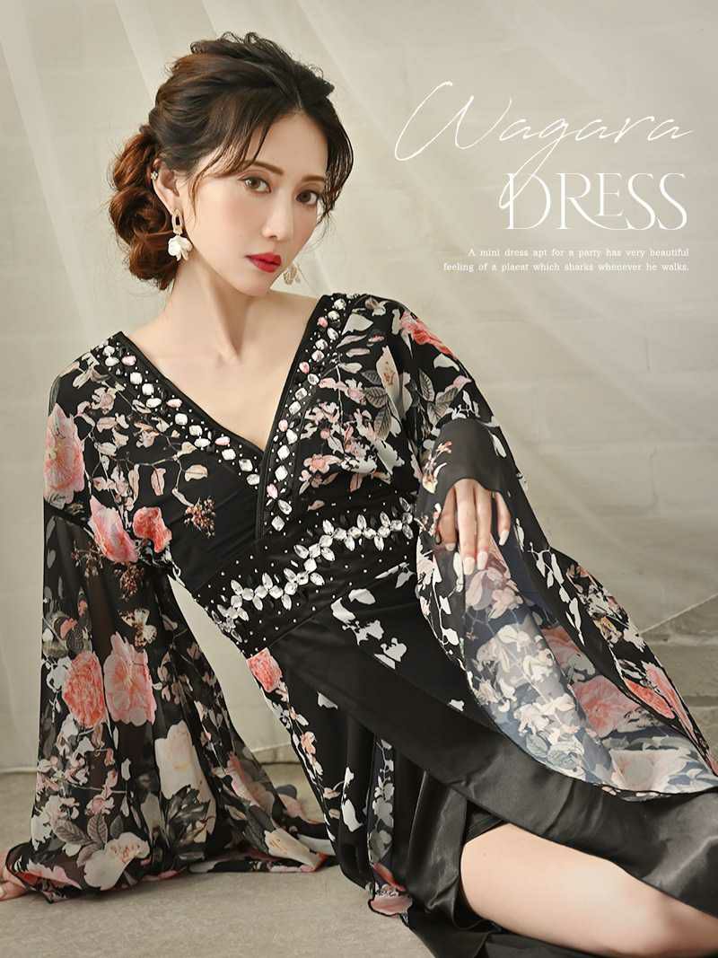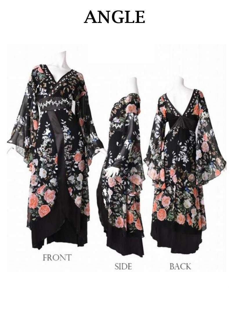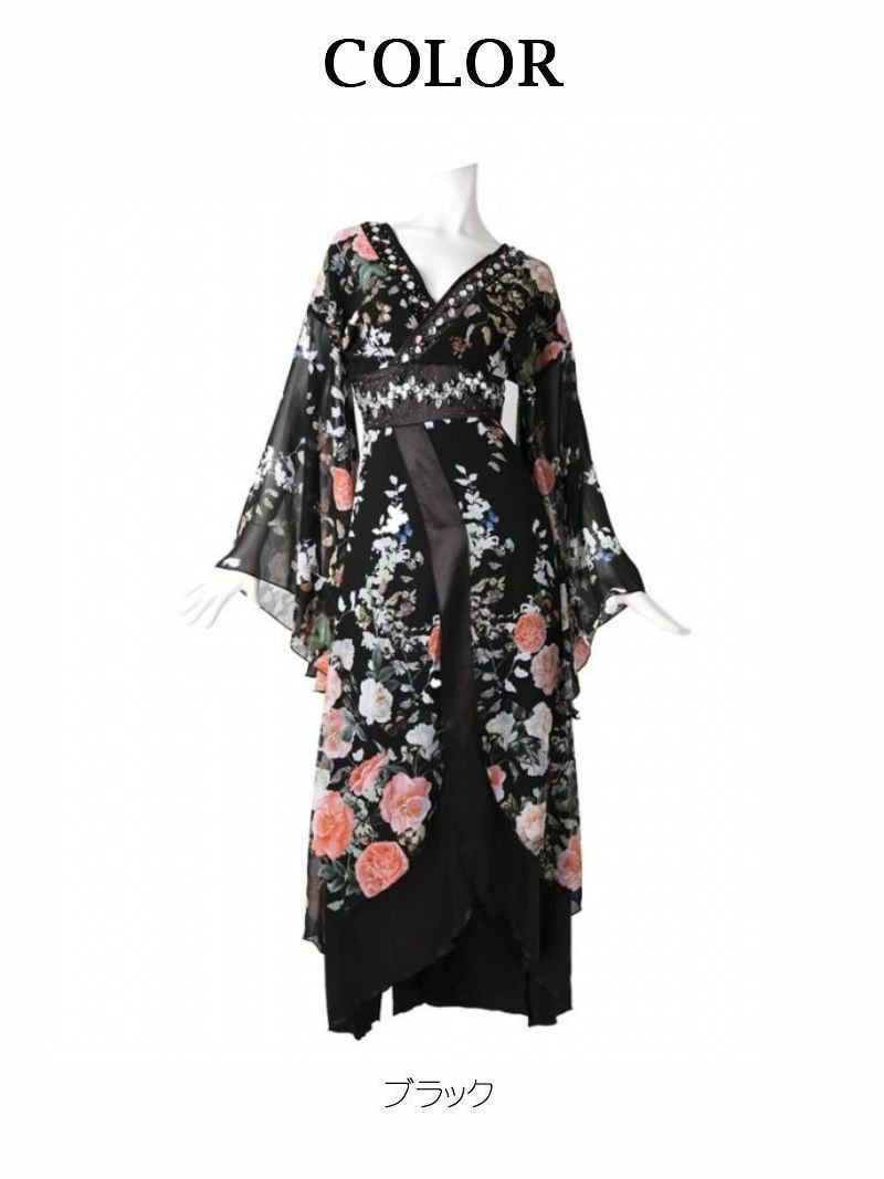 花魁スタイルを現代風にアレンジした、漆黒の美しさが際立つ和柄ドレス。袖付きデザインが上品さをプラスし、スリット入りのロングシルエットが大人の色気を引き立てます。