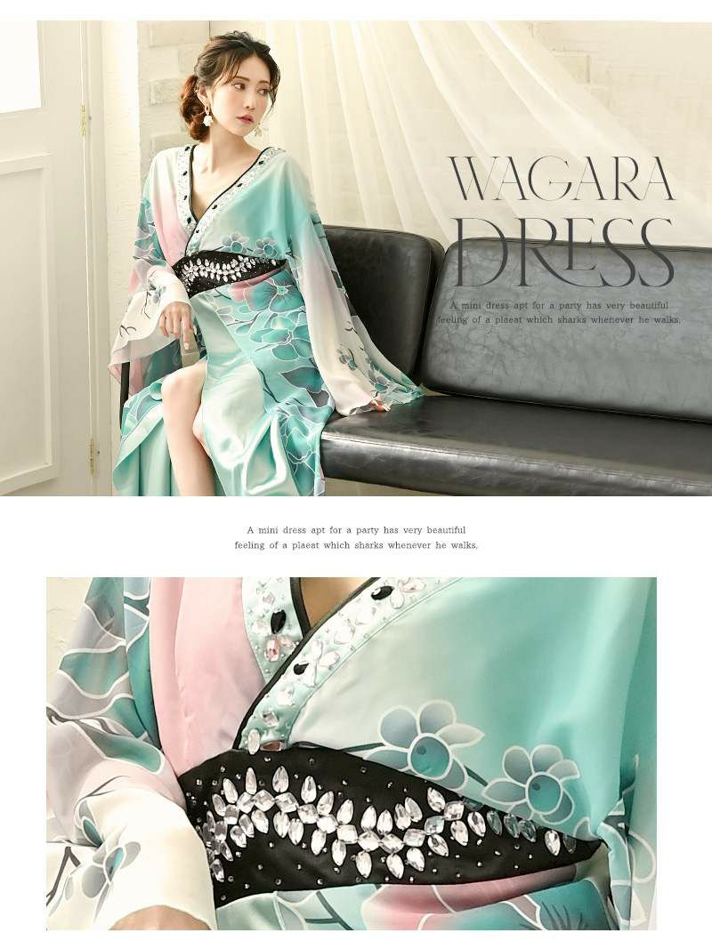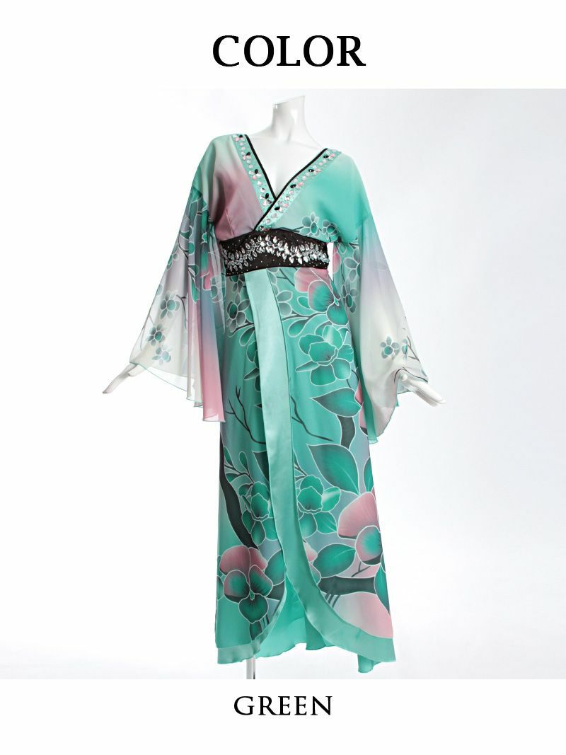 翠や碧の美しい和色が織りなす、上品でセクシーな和柄ドレス。流れるようなロングシルエットが大人の色気を引き立て、華やかな花柄が豪華な印象を演出します。