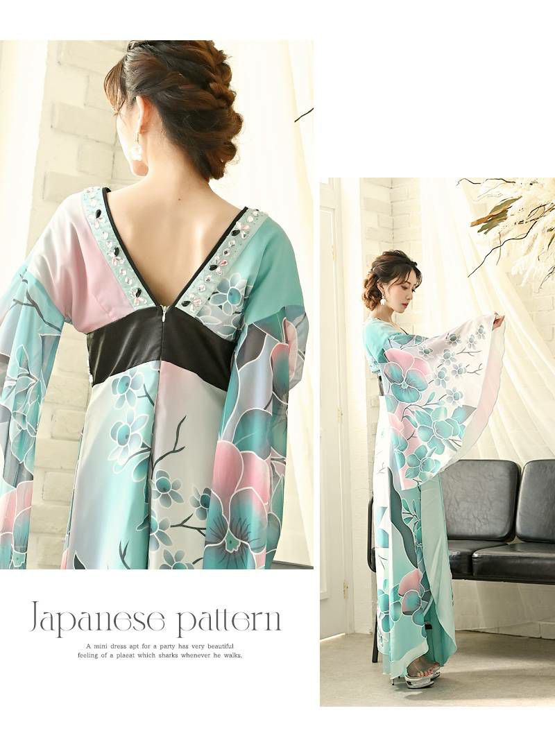 【訳ありアウトレット】翠や碧の和色テイストが綺麗セクシー和柄ドレス【流遊】