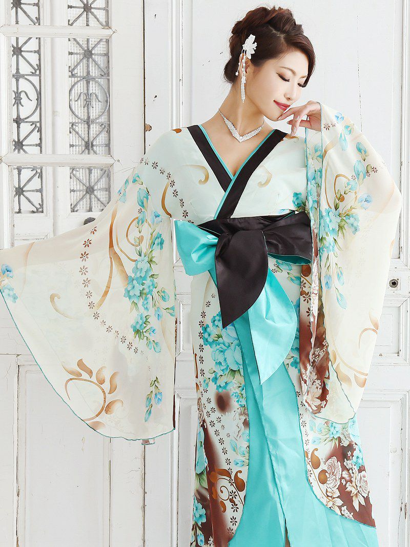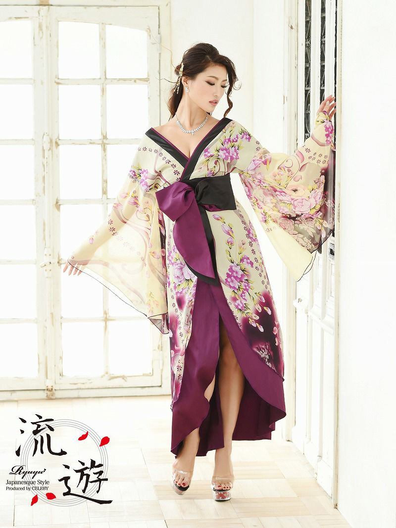 遊郭を思わせる艶やかなシルエットが、キャバ嬢の衣装やコスプレ、イベントで映える一着。着物ドレスならではの優雅さとセクシーな雰囲気を同時に楽しめます。