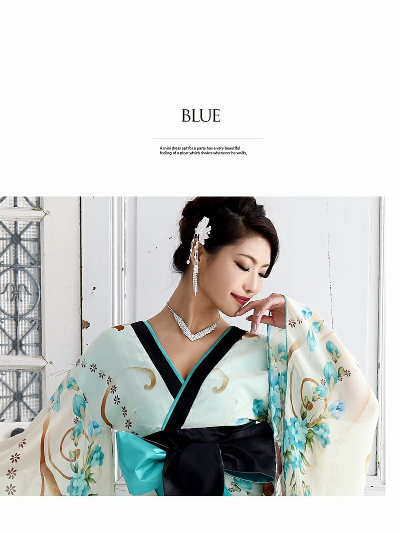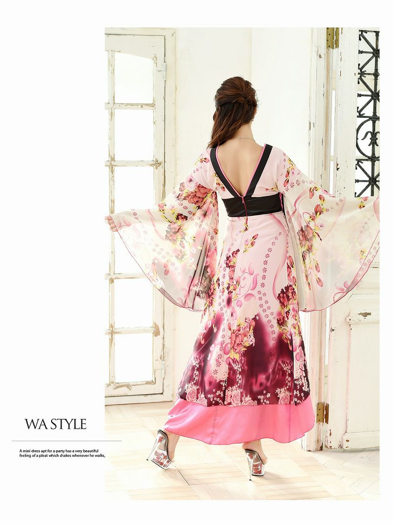 訳あり妖艶セクシー和風美女 【訳ありアウトレット】カラー豊富な花柄シフォン花魁風和柄ドレス【流遊】(S/M/L/XL)(ピンク/グリーン/パープル)