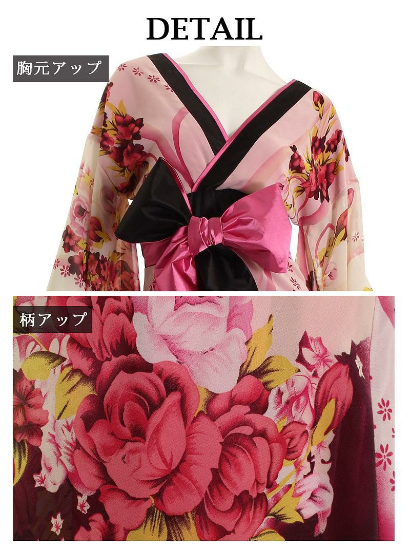 4. 【訳ありアウトレット】カラー豊富な花柄シフォン花魁風和柄ドレス【流遊】(S/M/L/XL)(ピンク/グリーン/パープル)