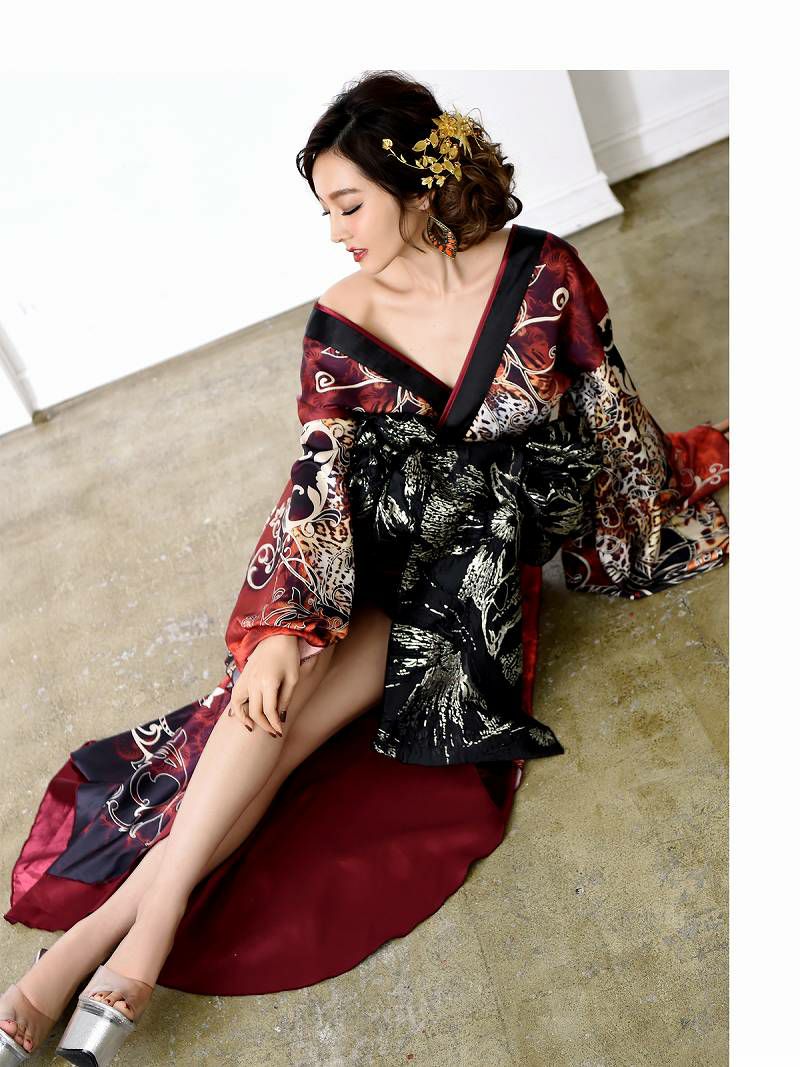 ヒョウ柄と和柄が絶妙に融合した、ゴージャスでセクシーな花魁ドレス。深みのある赤が華やかさを引き立て、ロング丈の着物ドレスが優雅なシルエットを演出。存在感抜群のデザインで、特別な夜を彩ります。