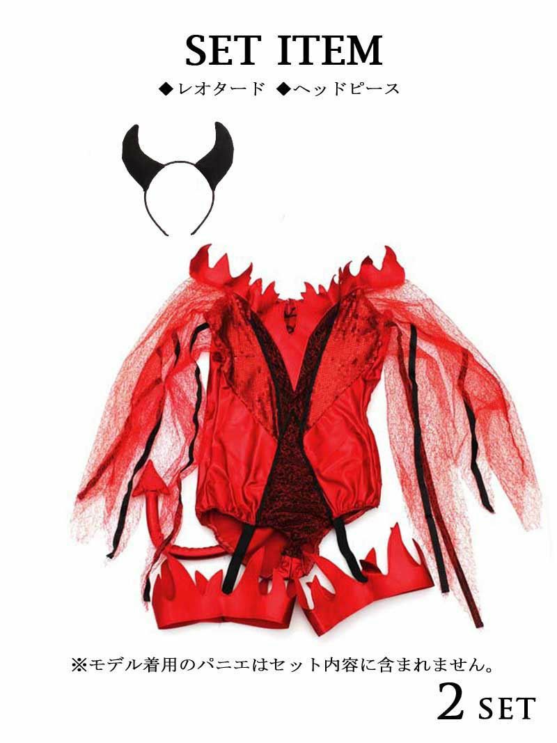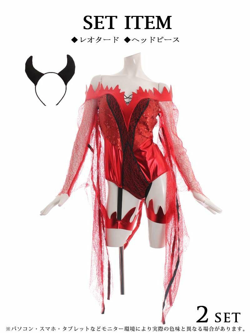 ブラッドレッドな炎を纏う女王様コス ハロウィンコスプレ 2点セット メタリック赤レオタード悪魔コスプレ【Ryuyu】オフショル長袖デビル仮装(S/M/L)(レッド)