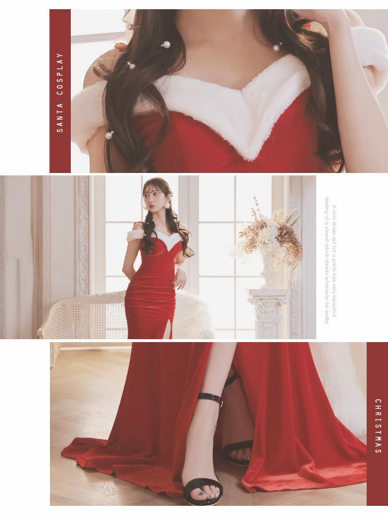 サンタコスプレ オフショルセクシースリットサンタコスプレロングドレス【Ryuyu】