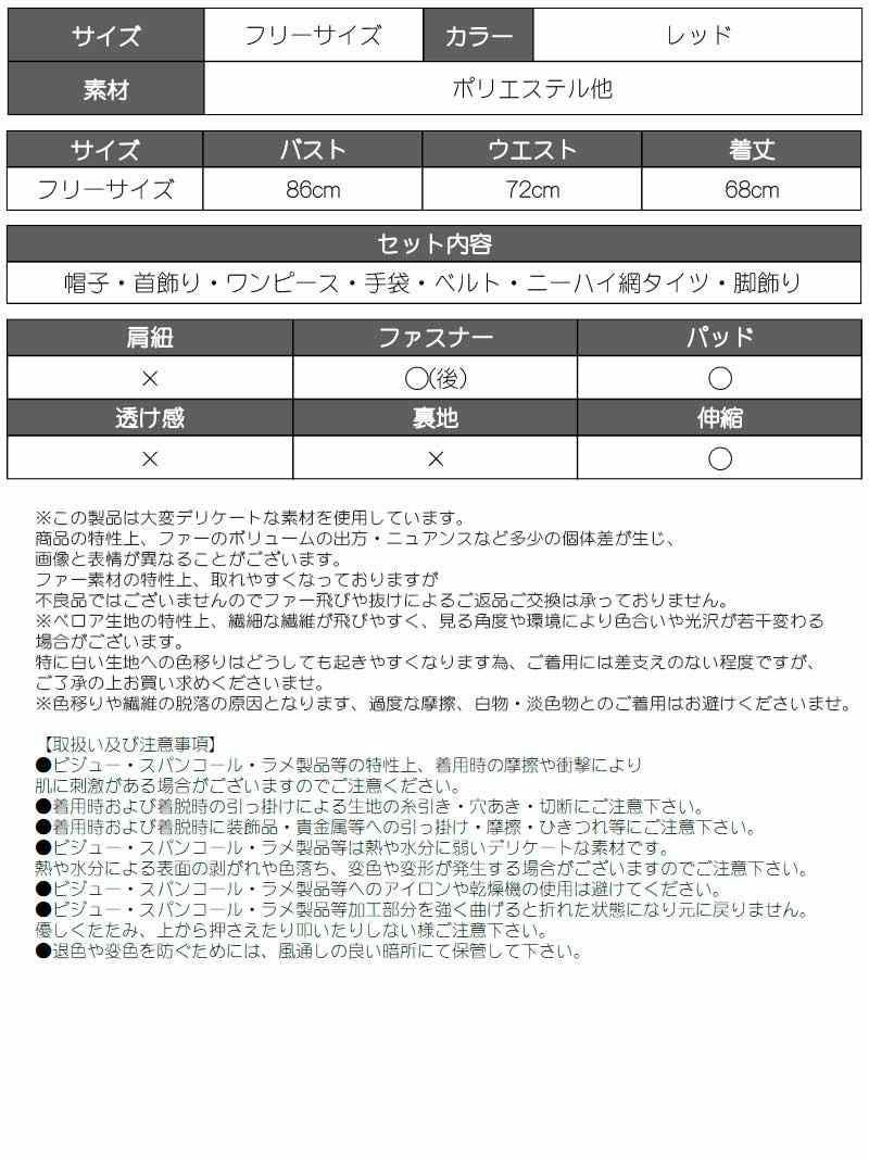 セット内容:帽子・首飾り・ワンピース・手袋・ベルト・脚飾り・ニーハイ網タイツ