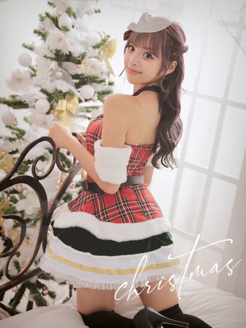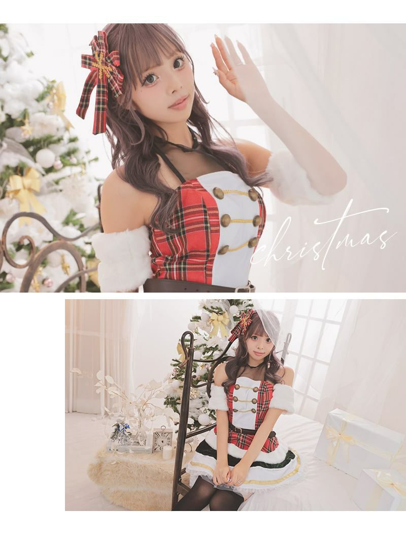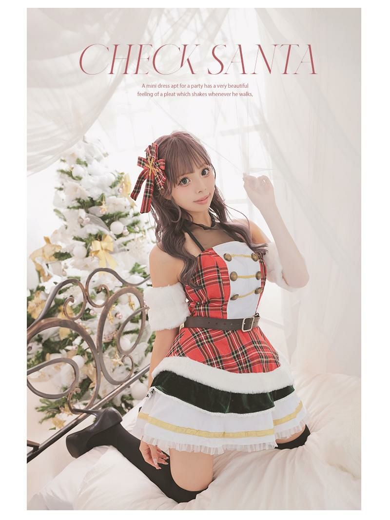 サンタコスプレ オープンショルダー赤色チェック柄Aラインサンタコスプレ6点セット あいさ 着用 キャバサンタ【Ryuyu】