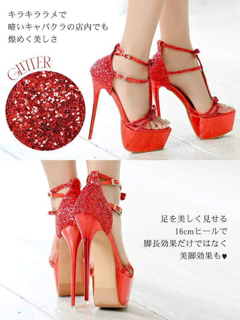 キラキラ足元からしっかり映え! レッドスパンコール16cmヒール前厚アンクルストラップキャバサンダル【Ryuyu】(S/M/L)(レッド)