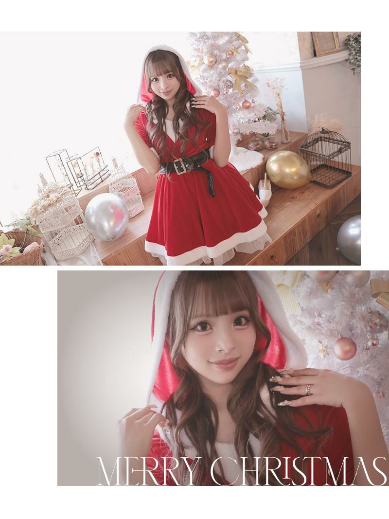 初心者さんにもぴったりな露出少なめサンタ☆ サンタコスプレ ガーリーフード付き袖ありレッドギャルサンタ あいさ 着用 サンタコスチューム【Ryuyu】(S/M/L)(レッド)