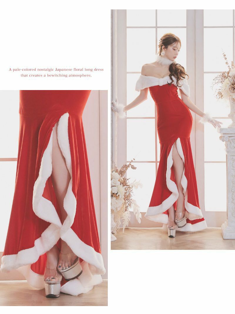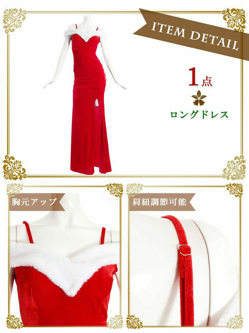 魅惑のスリット!色っぽオフショルで惹きつけるゴージャスサンタ サンタコスプレ オフショルセクシースリットサンタコスプレロングドレス【Ryuyu】(M/L/XL(2L))(レッド)