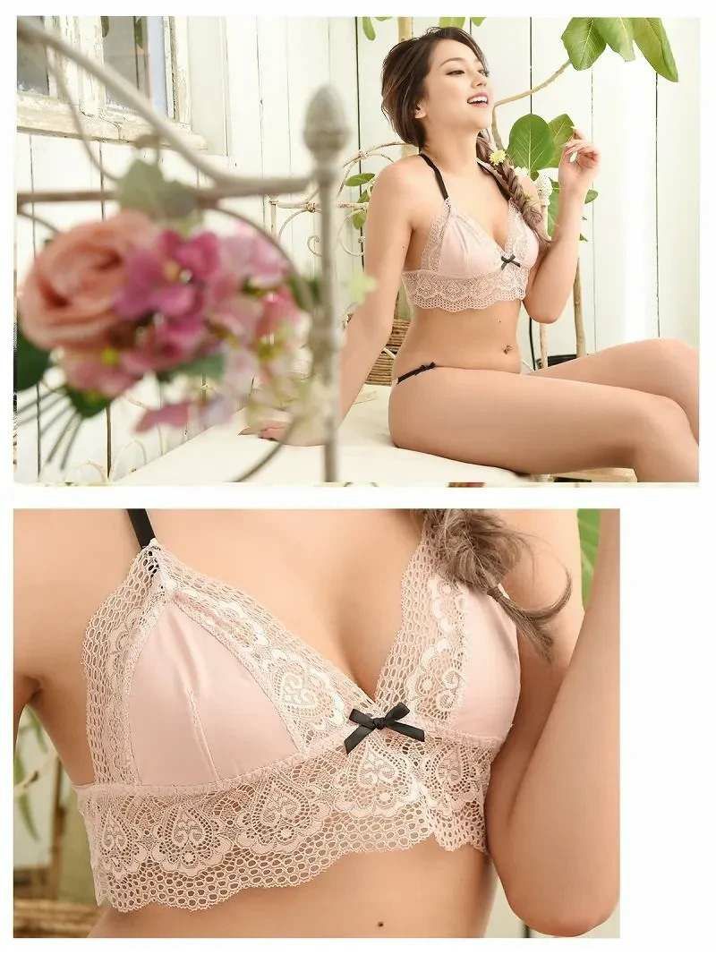 優雅なレースのブラショー スカラップレースフロントリボンブラ ワンカラーブラジャーショーツセット【Rwear】(S/M/L)(パープル/ピンク)