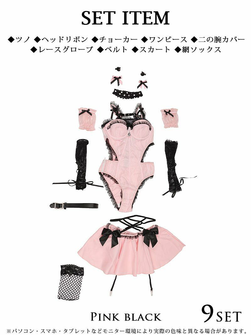 セット内容:ワンピース・スカート・ヘッドリボン・角・チョーカー・レースグローブ・二の腕カバー・ベルト・網ソックス