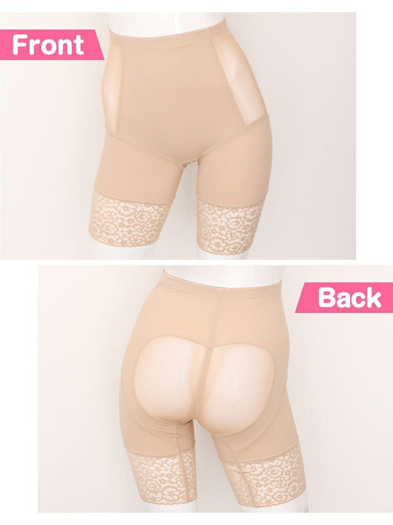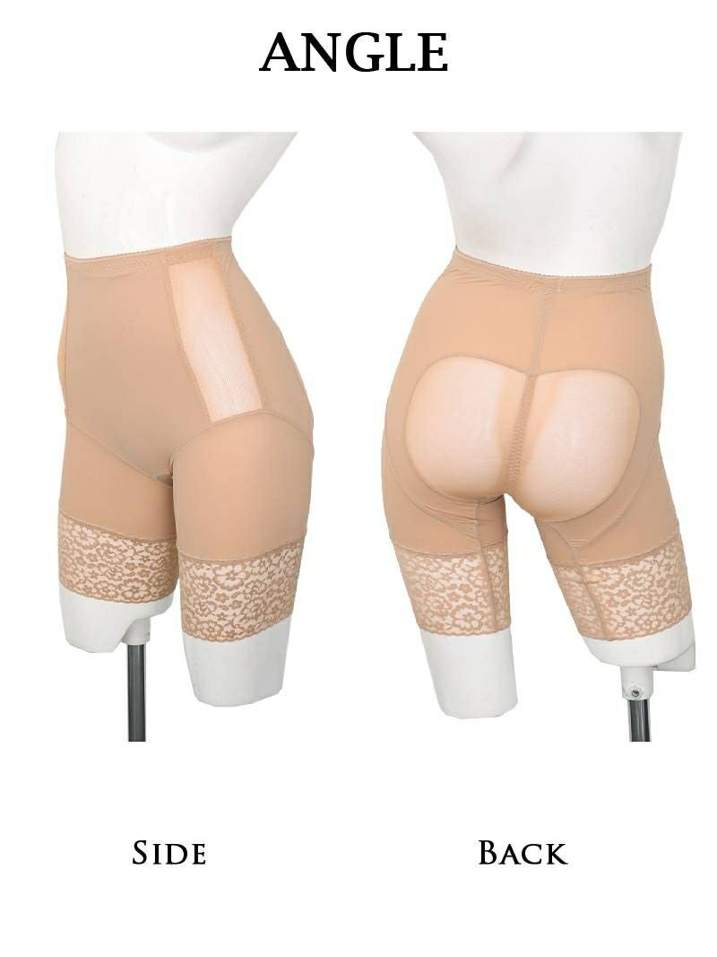 むれやすい部分はメッシュ加工でむれにくく爽快に着用できる補正下着はお尻をつぶさず立体的に整える効果も。