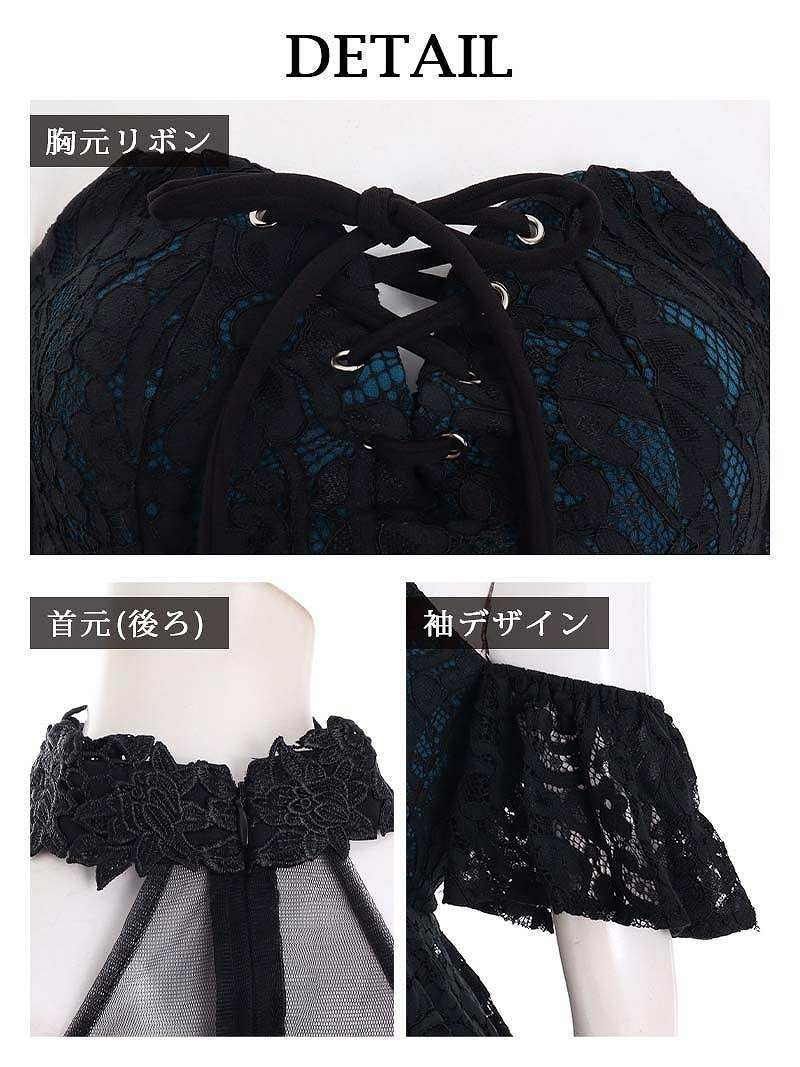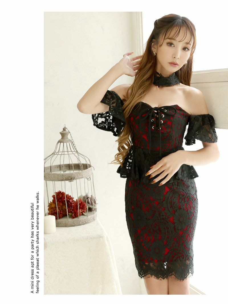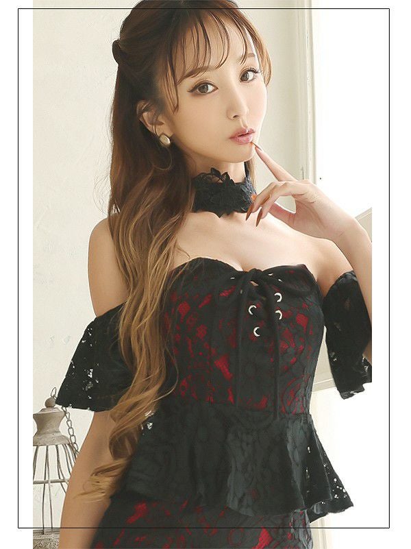 レースとオフショルデザインがデコルテを美しく演出し、セクシーさと上品さを兼ね備えています。