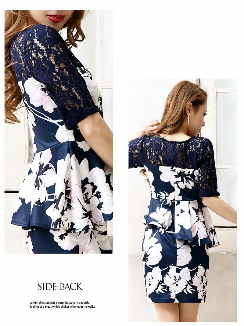 7. 花柄レース袖付きペプラムキャバクラドレス RIRI着用キャバドレス【Ryuyu】(S/M/L/XL)(ネイビー)