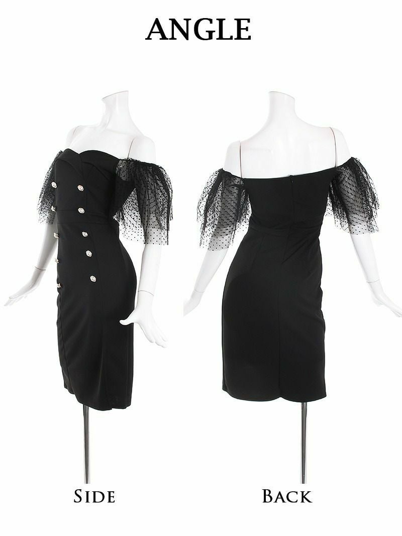 ふんわりボリューム袖で華やかさをON! オフショル袖付きドットレースタイトキャバドレス【RyuyuChick】(S/M/L)(ブラック/ホワイト)