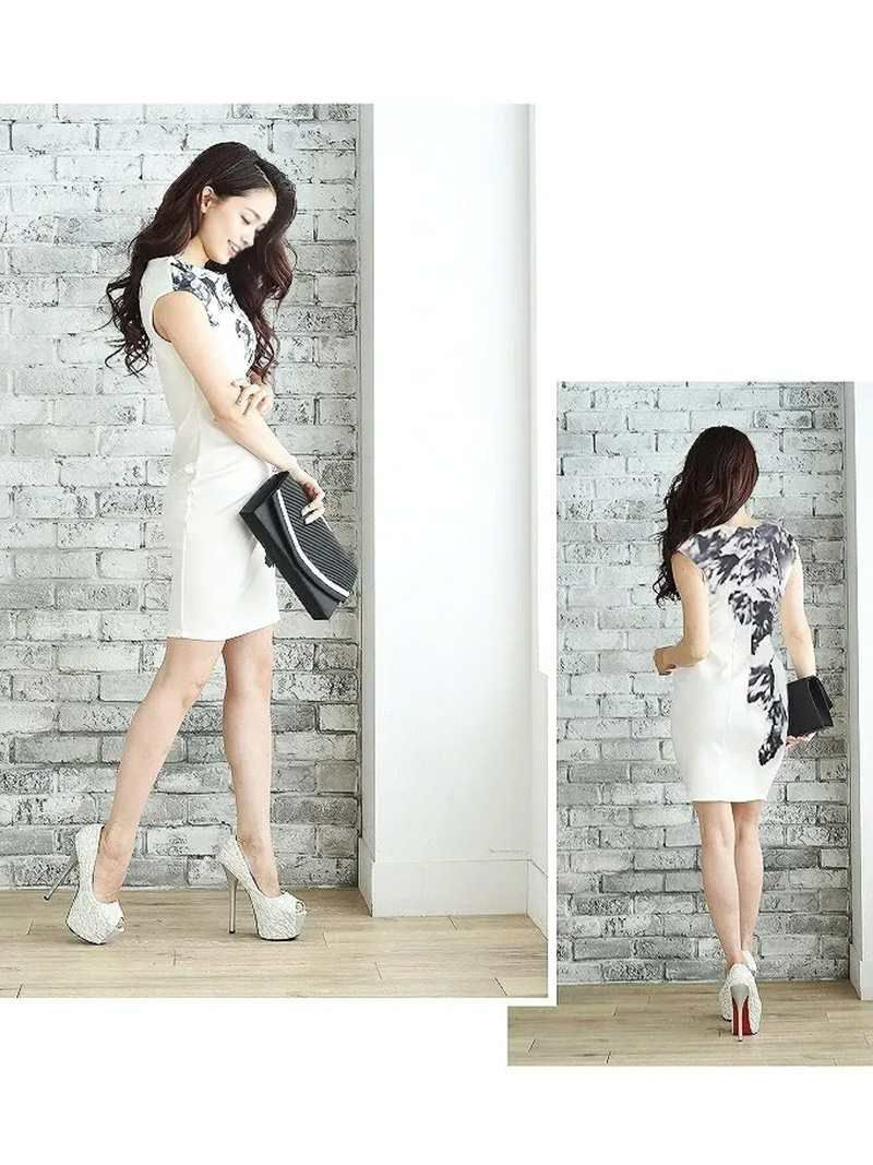 5. 墨絵風ぼかし花柄タイトキャバワンピース【Ryuyuchick】(S/M/L/XL)(ホワイト×ブラック)