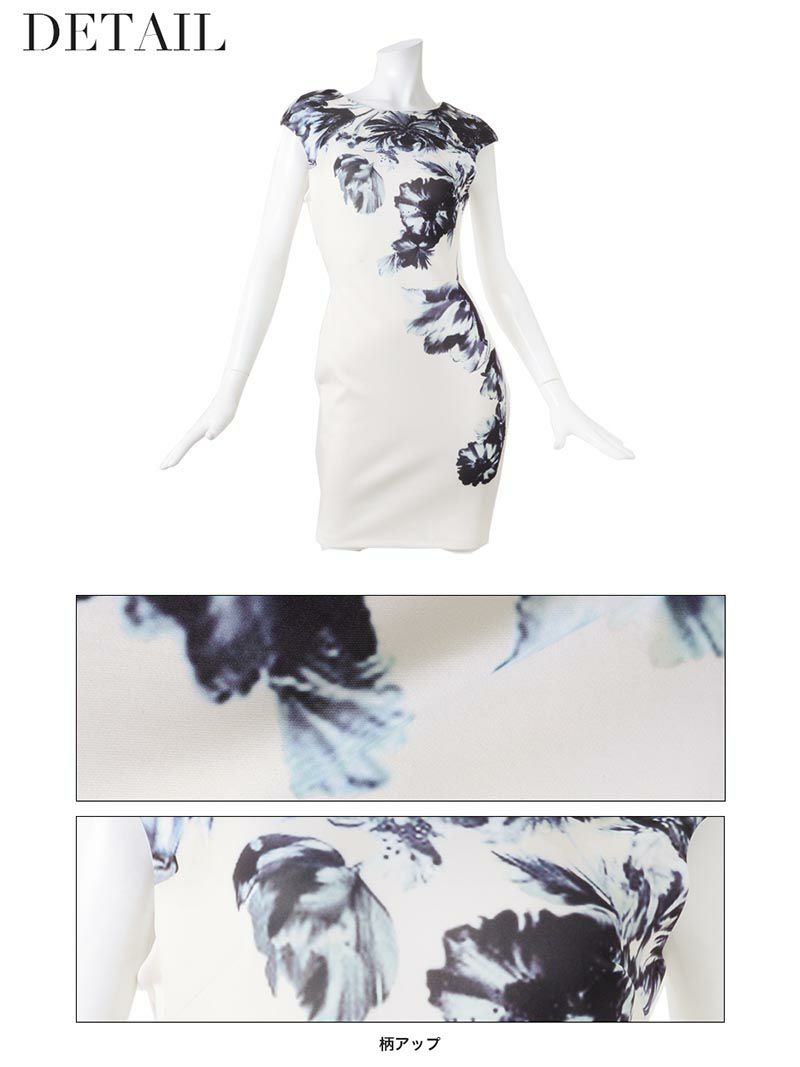 清潔感溢れるホワイトドレスに大人の色気漂う風格ある墨絵風花柄があしらわれた魅力的なキャバワンピースです。