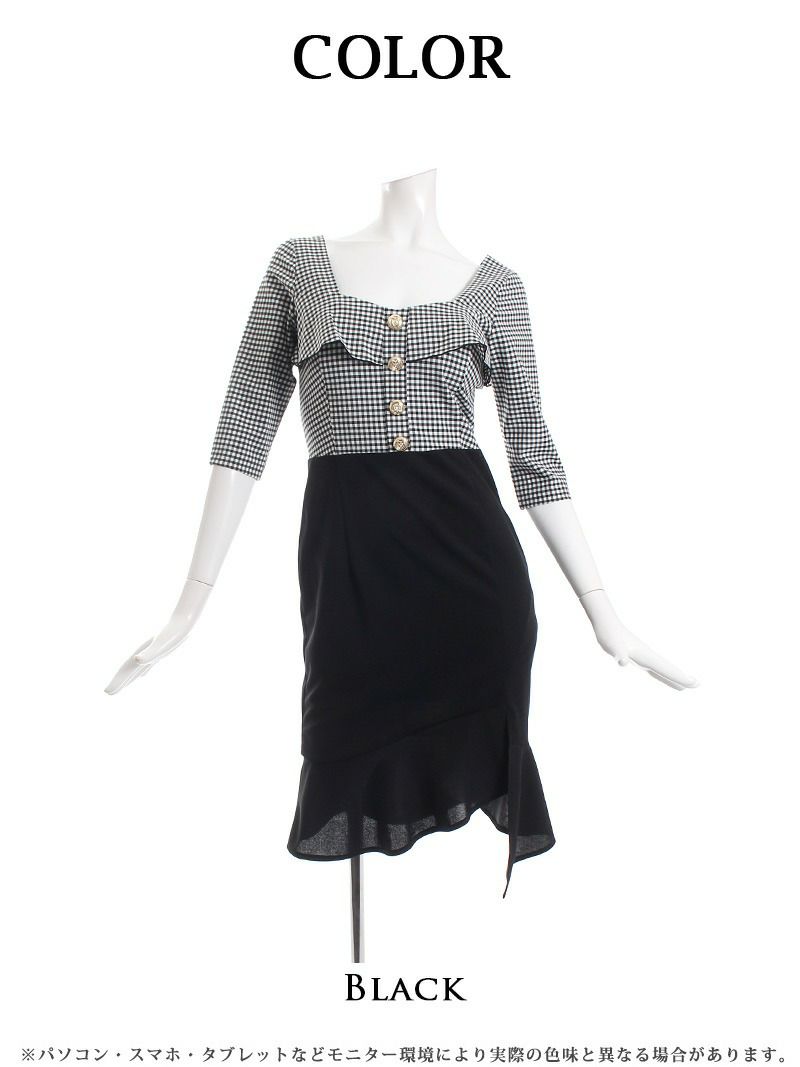 ギンガムチェック柄とフリルが特徴的な韓国風キャバワンピース。五分袖で上品さを保ちながら、アシンメトリーなデザインが一層スタイリッシュに仕上げます。